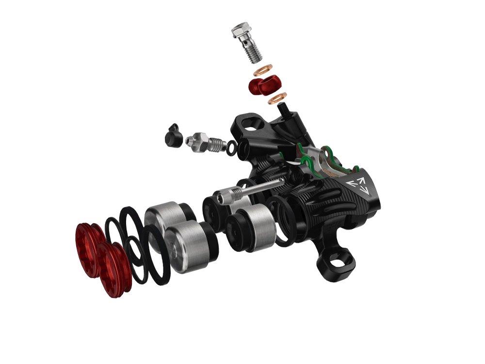 - Brzdy osazeny novým typem organických destiček "racing" a přibalený je 1 pár fialových E-bike destiček a 1 pár červených All-conditions destiček